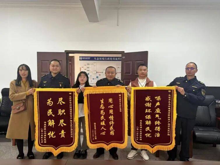 三是精准施策,以“对症下药”的智慧赢得群众认可。在充分调研与沟通的基础上,生态环境部门坚持科学治污、精准管控。针对噪声问题,指导企业对产生噪声的设备和生产工艺进行系统排查,采取调整高噪声设备作业时间、加装隔音屏障或吸声材料、优化工艺、调整使用部分设备等针对性措施。针对异味问题,督促企业加强环保设施运行管理,如加大废气处理设施中活性炭的更换频次、提升收集处理效率等,通过深度治理,周边群众满意度明显提升。2026年1月14日,市生态环境局和高新分局收到了高新区某小区业主代表专程送来的3面锦旗,锦旗上“生态为民暖人心 用心用情纾民困”、“感谢环保解民忧 噪声废气终得治”、“为民解忧 尽职尽责”的烫金大字,承载着居民对市生态环境局和高新分局高效解决小区噪声与异味环境信访投诉的诚挚谢意。这既是群众对环境治理工作的认可,更是对持续探索化解“邻避”矛盾、践行生态为民初心的生动注脚。